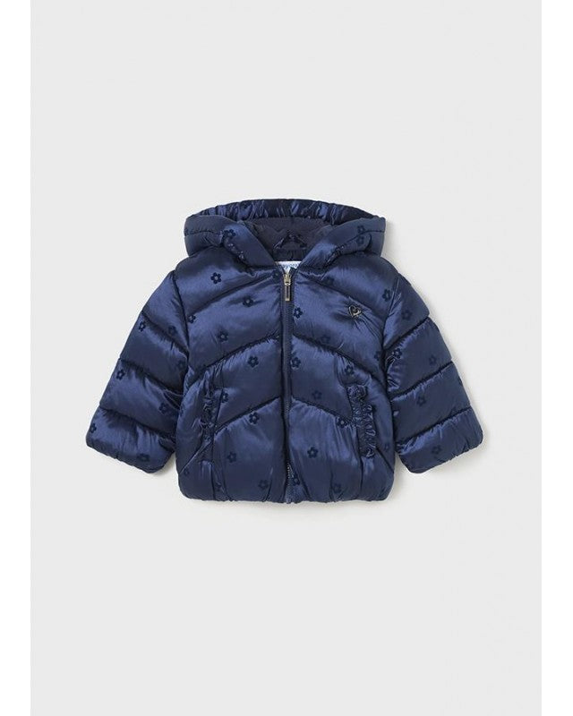 Abrigo acolchado en tono azul marino es perfecto para los días fríos, combinando calidez, estilo y comodidad. Su diseño incluye un delicado bordado de pequeñas flore con capucha integrada, cierre frontal con cremallera y bolsillos laterales con frunces decorativos, este abrigo garantiza abrigo y libertad de movimiento.