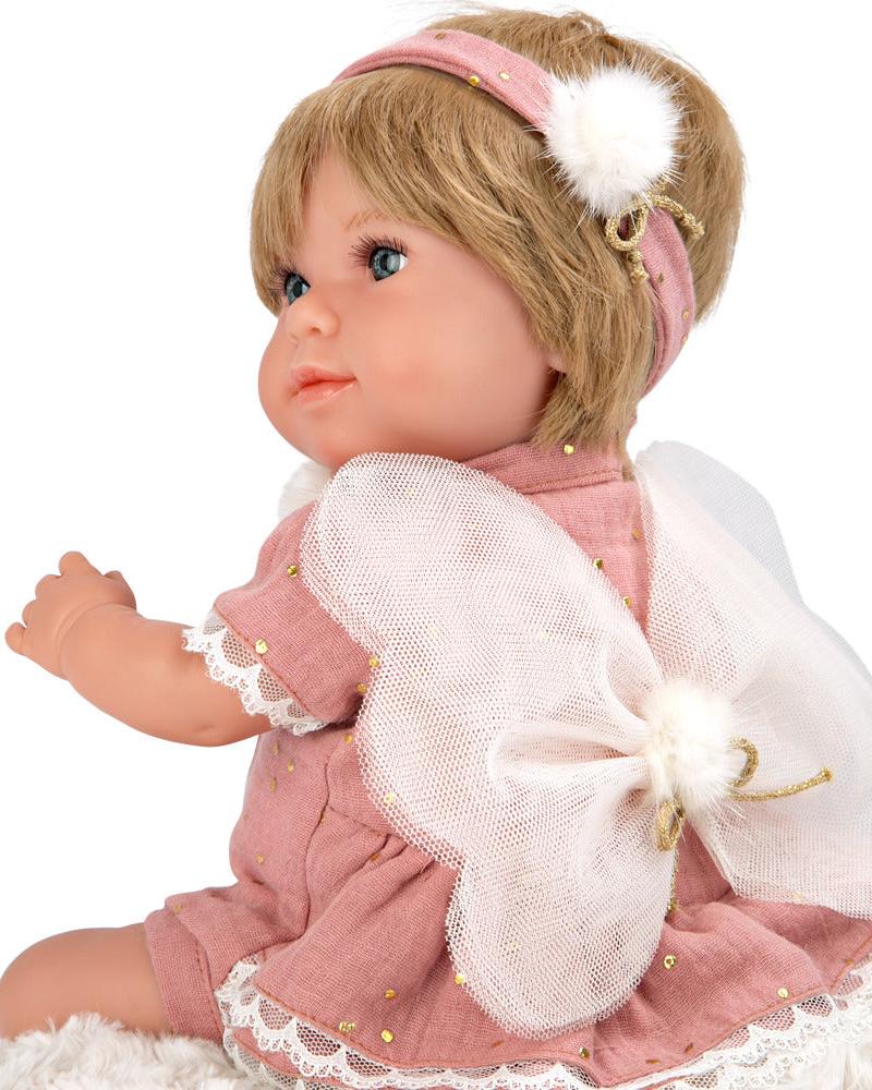 Bebe real de 35 cm con cuerpo blando y extremidades de vinyl, a la que se ha vestido en tonos rosa maquillaje e incorporado unas alas de mariposa. Incluye manta y chupete.