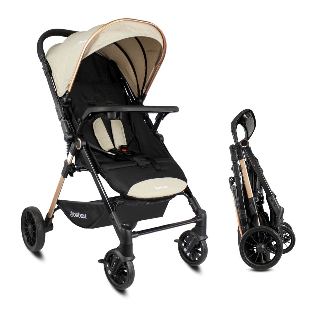 Telas con filtro uvEstructura robusta pero livianaRuedas de 8" para mayor estabilidadManilar reversibleAmplia canastilla portaobjetos Bandeja frontal removibleCanopy extensible con visor y visera en mallaFreno en las ruedas traserasSistema rueda libreEspaldar reclinableCinturón de seguridad de 5 puntosPortavasosReposapies ajustable