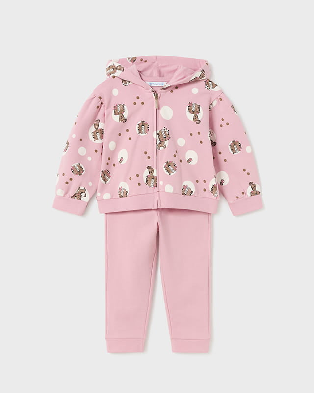 Conjunto niña 2 piezas, compuesto por una chaqueta estampada tigres y una sudadera tipo joggers con cintura elástica para un ajuste cómodo color rosa.