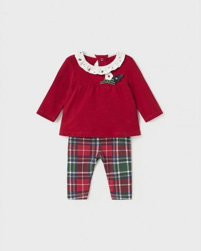 Conjunto 2 piezas, compuesta por un saco color rojo con cuello blanco, detalle de flores con lazito.