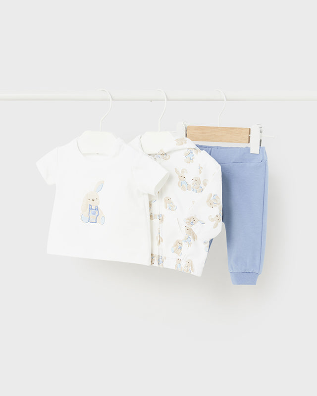 Conjunto 3 piezas, compuesta por una chaqueta estampada conejos, camisa blanca con estampado de conejop en la parte delantera y una sudadera con cintura elástica para un ajuste cómodo color azul bebe.