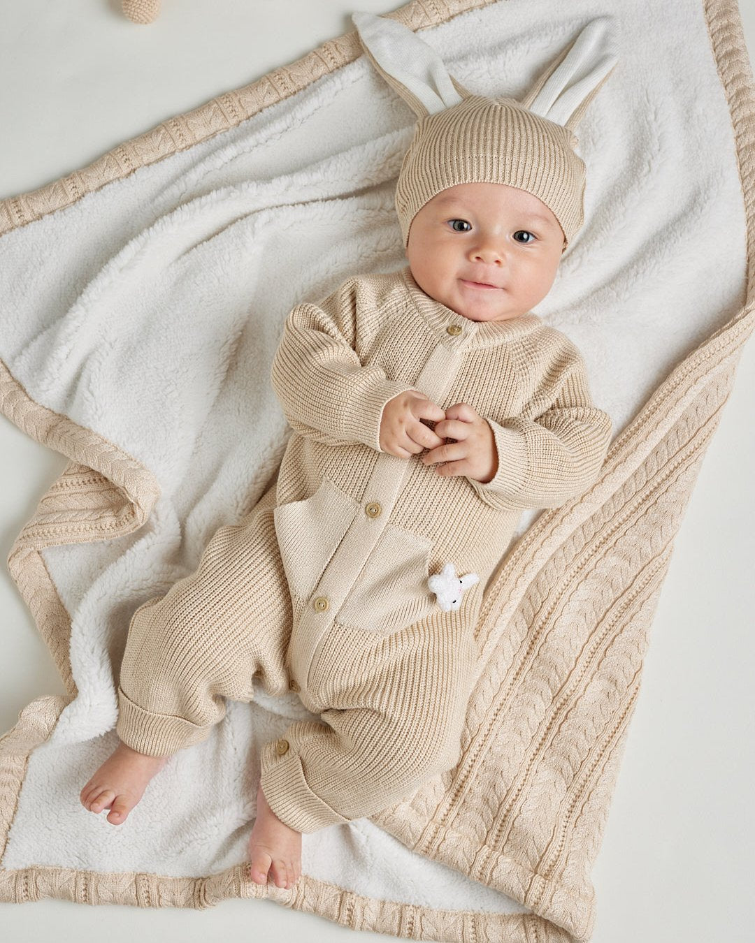 Enterizo manga larga con motivo de conejo, ideal para los primeros meses. En el bolsillo, trae un tierno conejito que se puede quitar y poner.