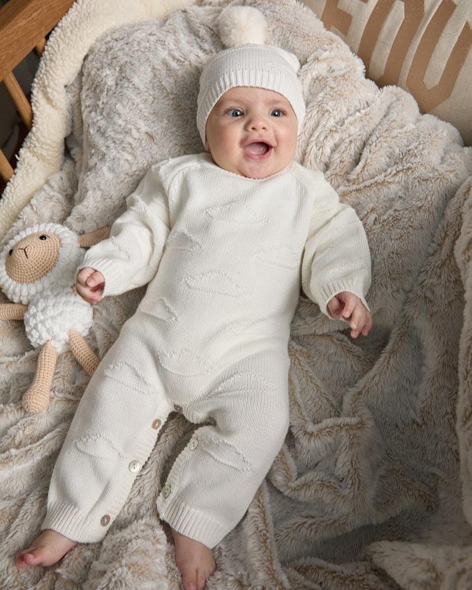 Enterizo tejido en algodón 100% con motivos de nubes en color crudo. Incluye enterizo y gorro.
