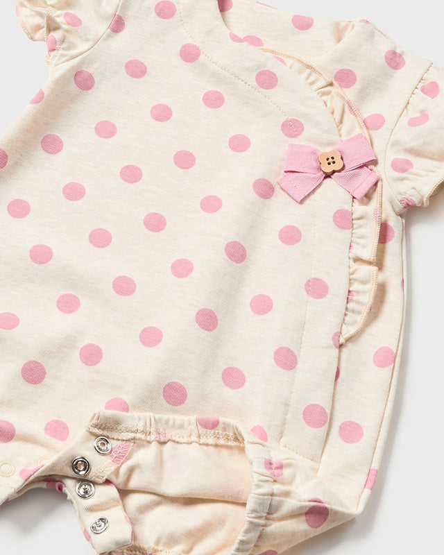 Mameluco manga corta, cierre lateral con botones a presión. Cierre con botones en la entrepierna.