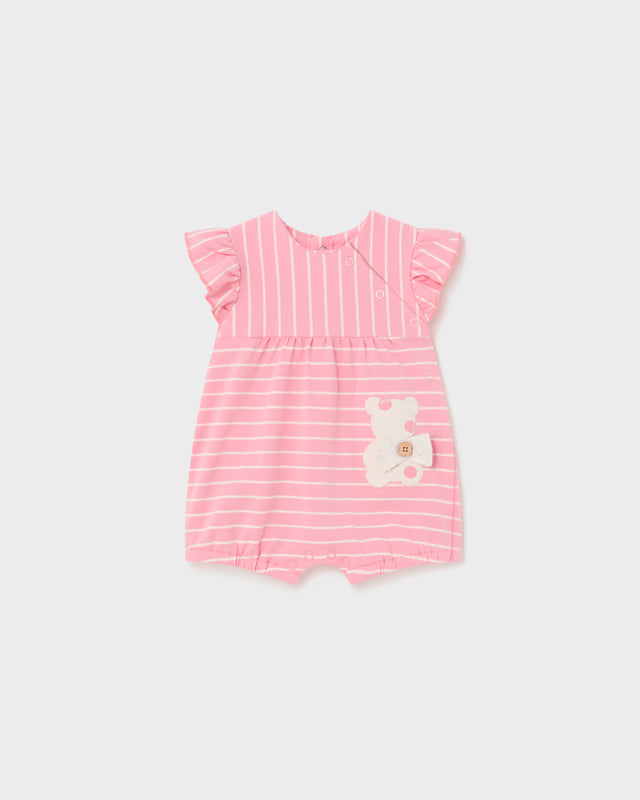 Mameluco manga corta, cierre lateral con botones a presión. Cierre con botones en la entrepierna.