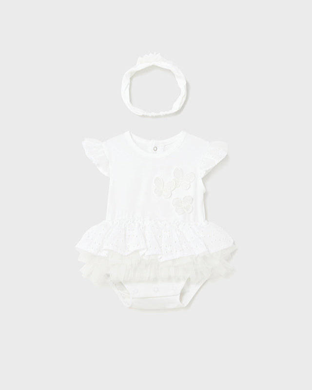 Mameluco con tutu de tul en tela, con mariposas en alto relieve y diadema para el cabello oufit ideal para la fotos de su primer.