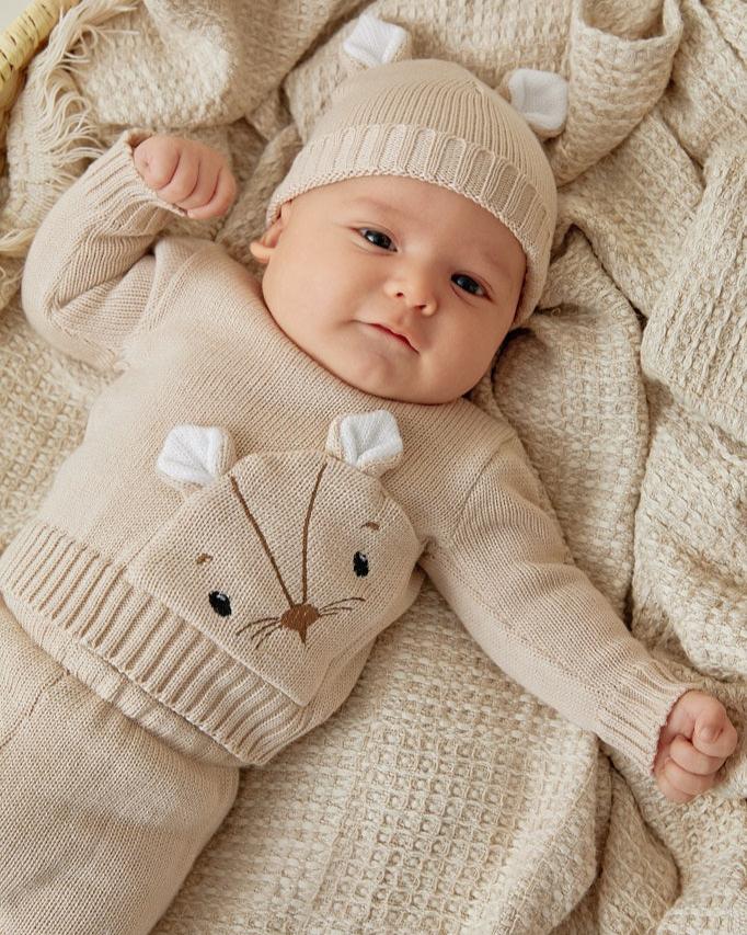 Set 3 piezas tejido, incluye buzo, pantalón y gorro. Un set con diseño divertido y tierno. Las orejas de ardilla le darán un toque único a tu bebé.