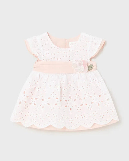 Vestido de manga corta para recién nacido con detalles de volantes. Cuello redondo. Cierre con cremallera en la parte trasera para una puesta ágil y rápida. Tejido perforado original y fresco.